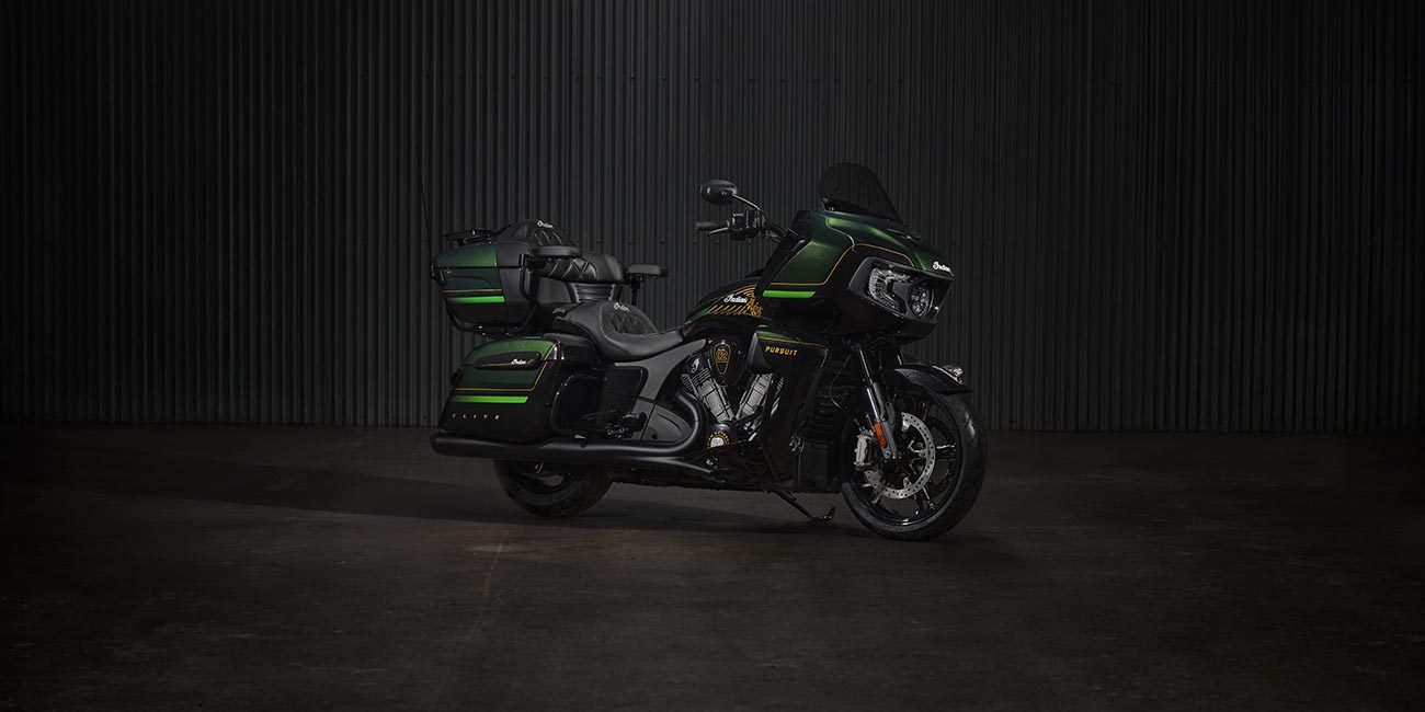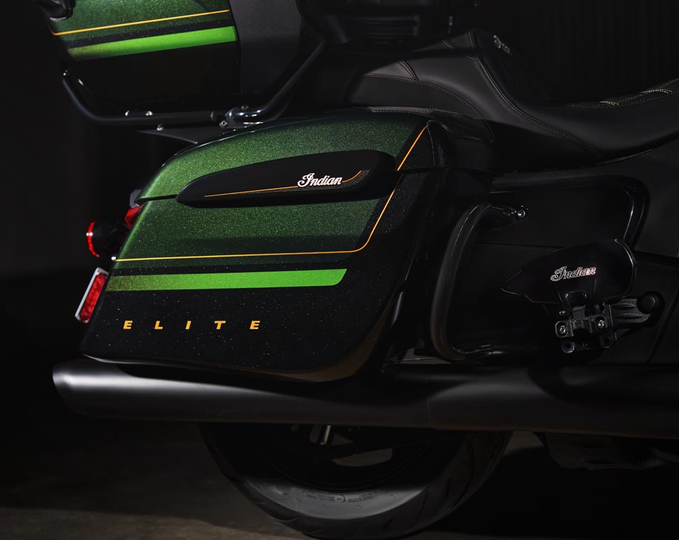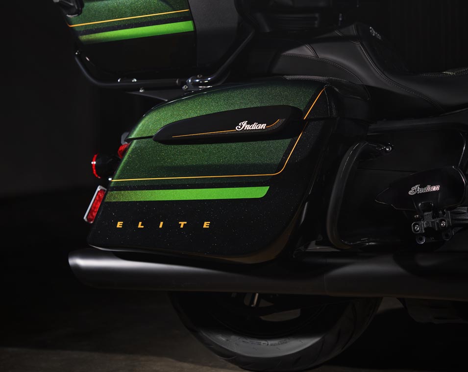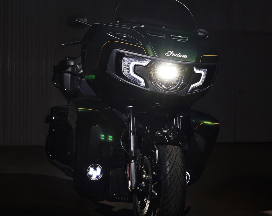 | Equipements Standard | Sacoches rigides verrouillables à distance, pare-brise à réglage électrique, plus de 140 litres de rangement, allumage sans clé, aérateurs de carénage réglables, chargeur USB, système de contrôle de la pression des pneus (TPMS), plateaux repose-pieds pilote et passager, selles chauffantes à surpiqûres de couleur verte, commodos rétroéclairés avec poignées chauffantes et accoudoirs pour le passager. |